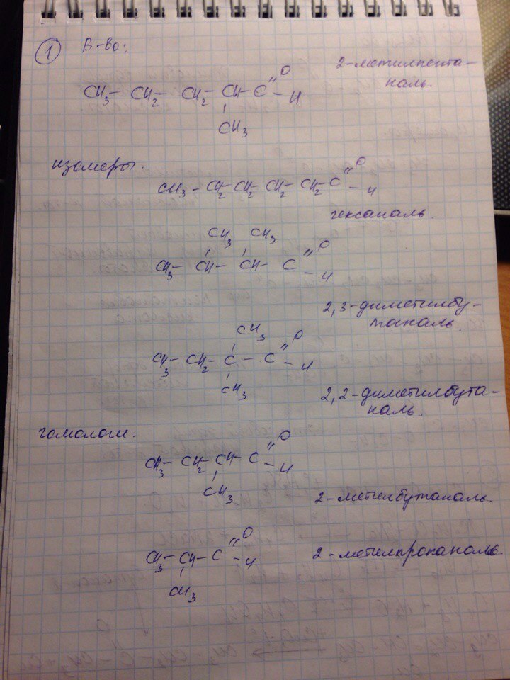 1. Напишите структурные формулы 3 изомеров (разного вида, если это возможно) и 2 гомологов для 2-метилпентаналя. Все вещества назовите.