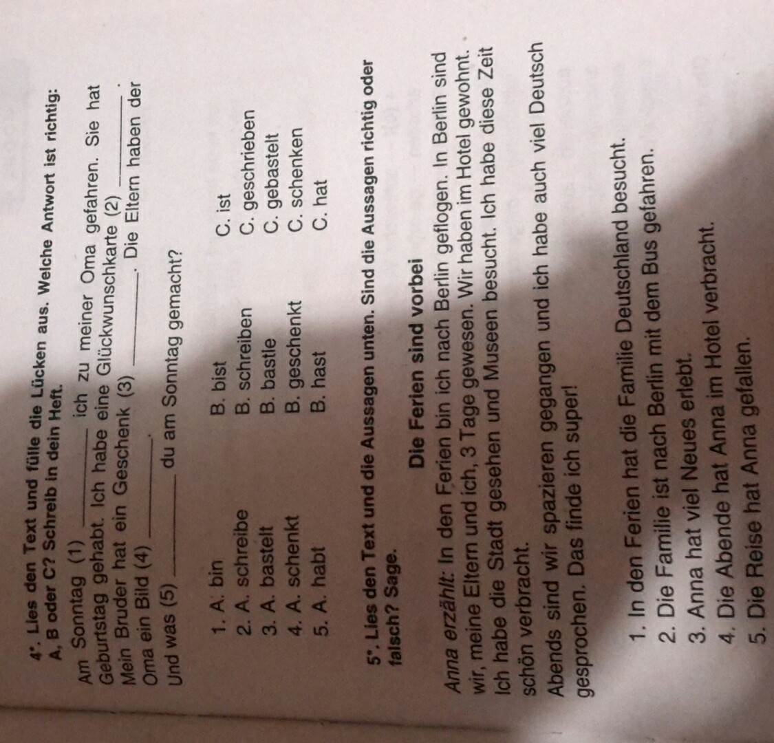 5. 1 richtig 2 falsch (Die Familie ist nach Berlin geflogen.) 3 richtig 4 falsch (Abends ist sie spazieren gegangen.) 5 richtig