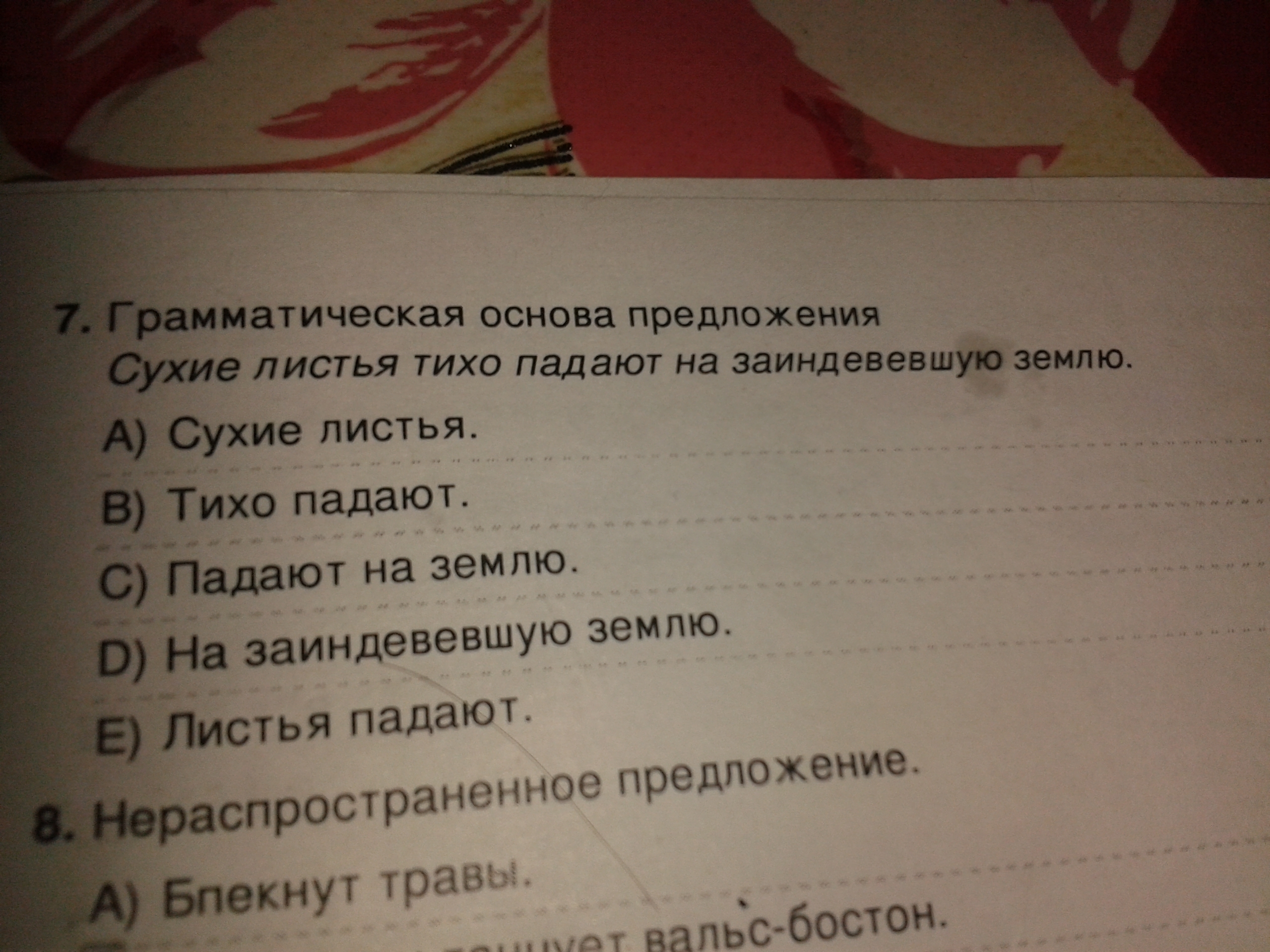 На седьмой ответ Е, граматическая основа листья падают