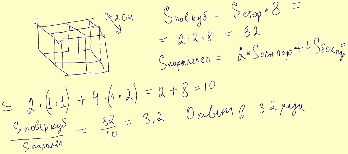 Куб со стороной 2 см распилили на 4 одинаковых параллелепипеда. Во сколько раз площадь поверхности куба больше площади поверх одного параллелепипеда