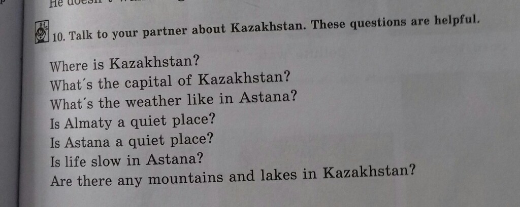 Поговорите со своим собеседником о Казахстане, отталкиваясь от вопросов.