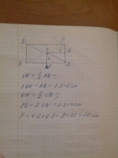 точка пересечения диагоналей прямоугольника удалена от его сторон на 2 см и 3 см. Найдите периметр прямоугольника