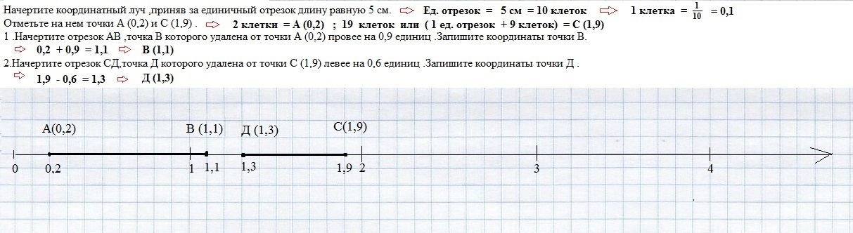 2.Начертите отрезок СД,точка Д которого удалена от точки С (1,9) левее на0,6 единиц .Запишите координаты точки Д .