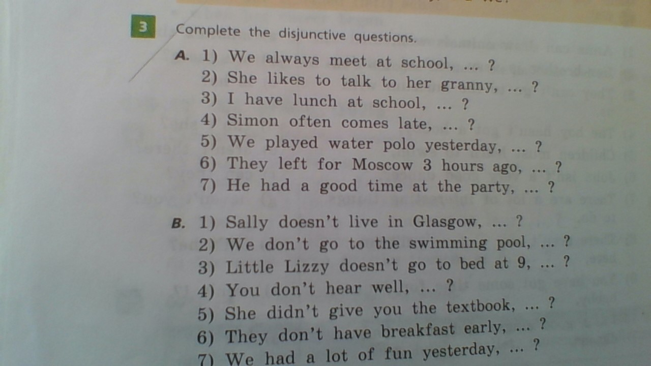 a)1) we always meet at school, don't we? 2) she likes to talk to her granny, doesn't she? 3) I have lunch at school, don't I? 4)Simon often comes late, doesn't he? 5)we played water polo yesterday, didn't we? 6)they left for Moscow 3 hours ago, didn't they? 7) he had a good time at the party, didn't he? b)1) does she? 2) do we? 3)does she? 4) do you? 5) did she? 6) do they? 7) didn't we? Удачи тебе!!!
