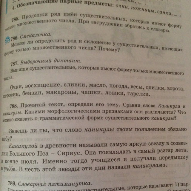 Выборочный диктант. Выпиши существительные, которые имеют форму только множественного числа. 787 упражнение