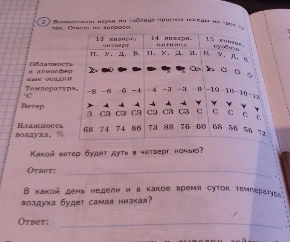 1 вопрос: западный ветер. 2 вопрос: в субботу вечером будет самая маленькая температура