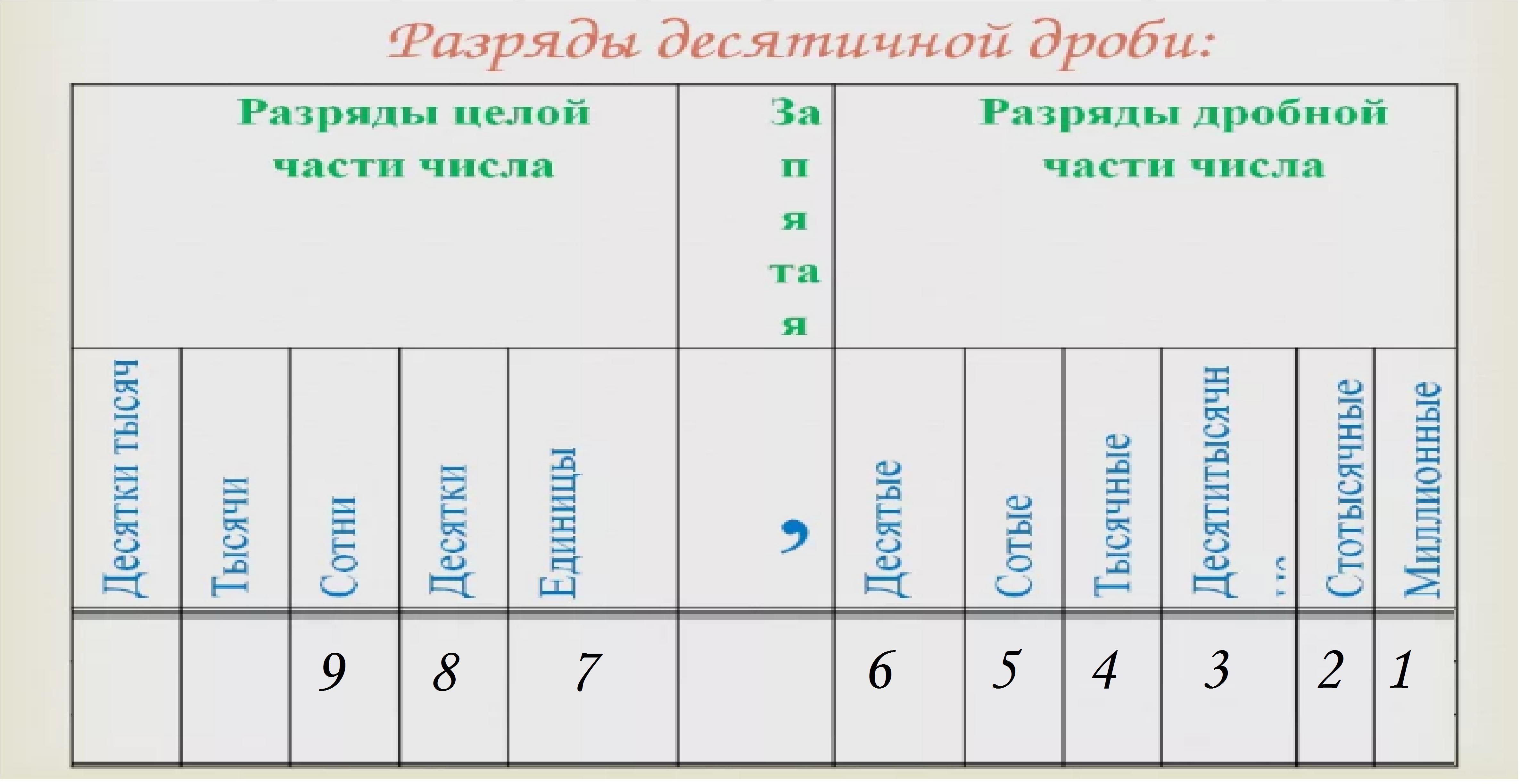 Дано число 987654321. Какая цифра записана в разряде: 1) сотых; 2) десятых; 3) тысячных; 4) десятитысячных; 5) стотысячных; 6) миллионных?