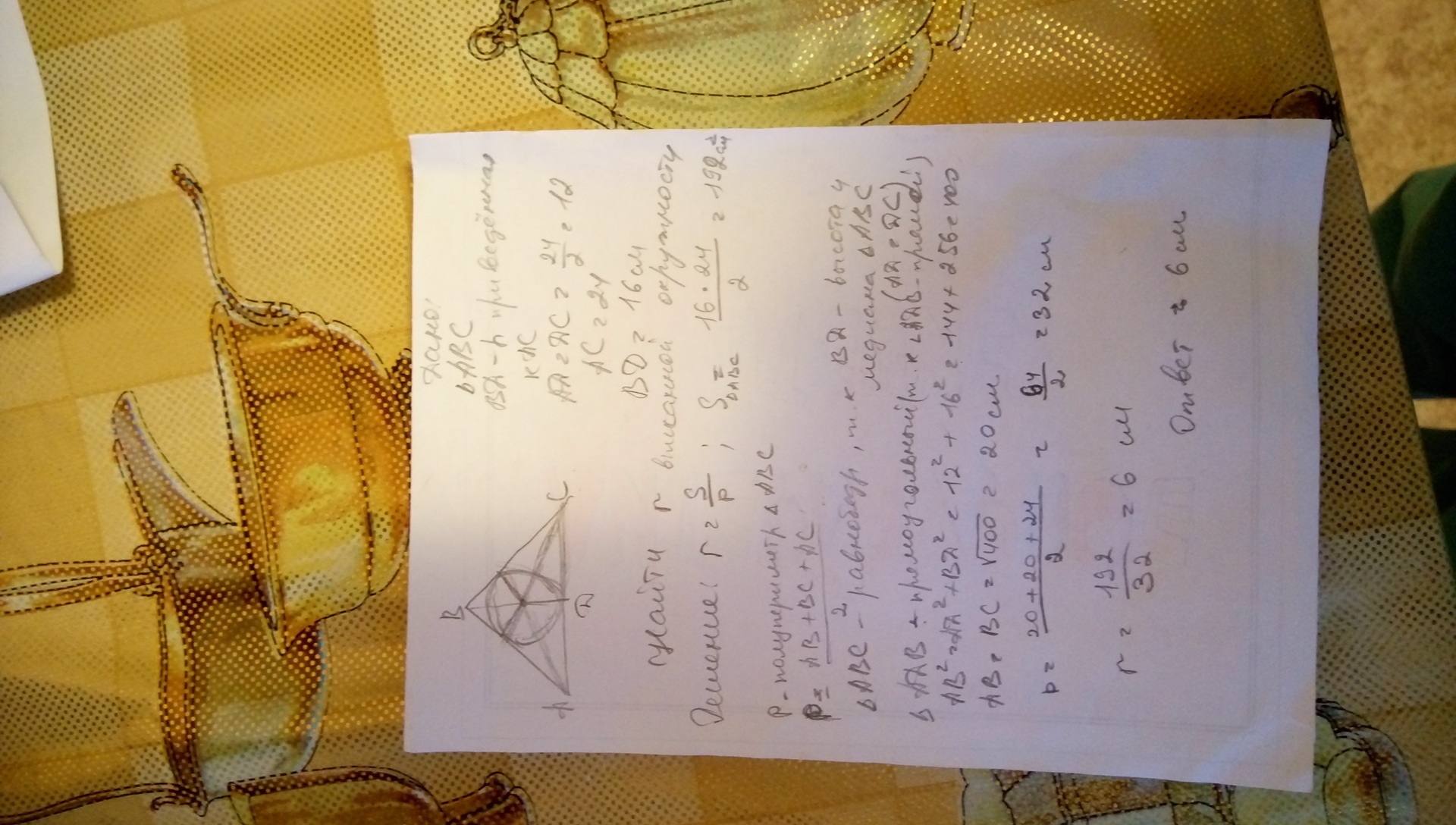 Сторона треугольника равна 24 см, а высота, проведенная к этой стороне, делит ее пополам. Найдите радус вписанной окружности, если высота равна 16см.