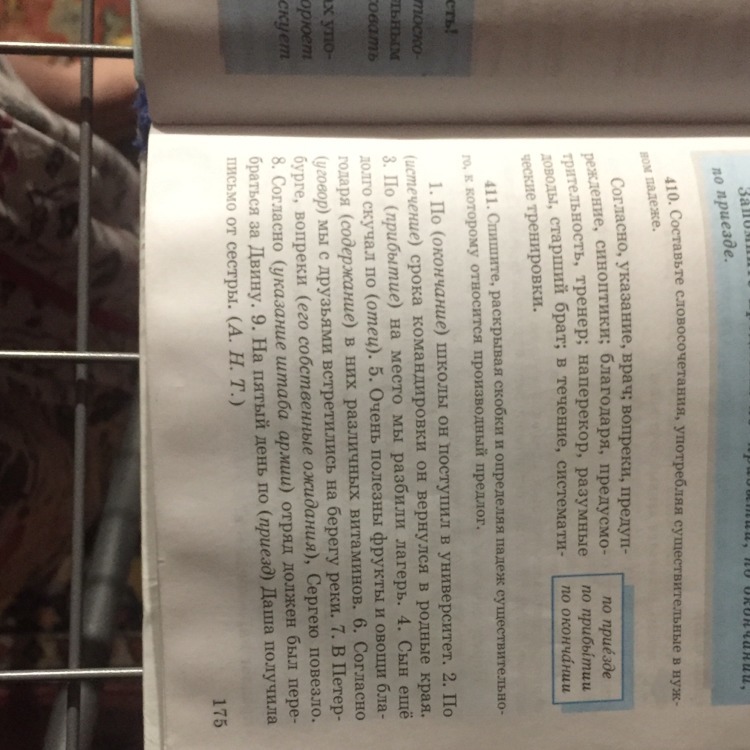1. По окончанию (Д.п) школы он поступил в университет. 2. По истечению (Д.п) срока командировки он вернулся в родные края. 3. По прибытию (Д.п) на место мы разбили лагерь. 4. Сын еще долго скучал по отцу (Д.п). 5. Очень полезны фрукты и овощи благодаря содержанию (Д.п) в них различных витаминов. 6. Согласно уговору (Д.п) мы с друзьями встретились на берегу реки. 7. В Петербурге, вопреки его собственным ожиданиям (Д.п), Сергею повезло. 8. Согласно указанию Д.п) штаба армии отряд должен был перебраться за Двину. 9. На пятый день по приезду (Д.п) Даша получила письмо от сестры.