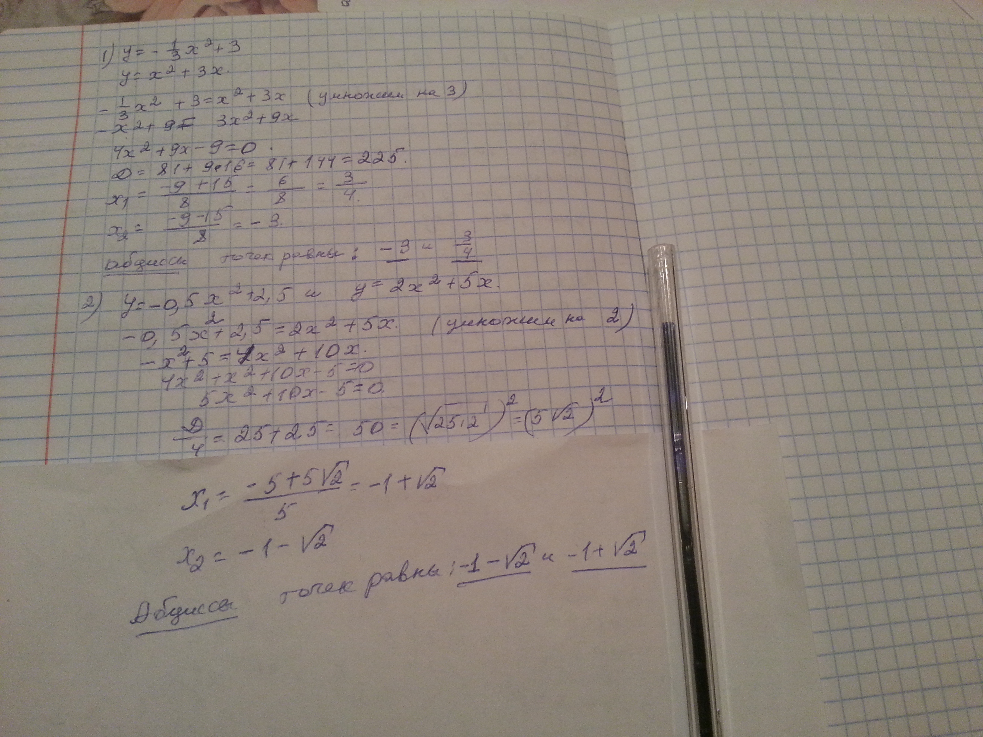 найдите абсциссы точек пересечения графиков функций:y=-1/3x^2+3 и y=x^2+3x;y=-0.5x^2+2.5 и y=2x^2+5x