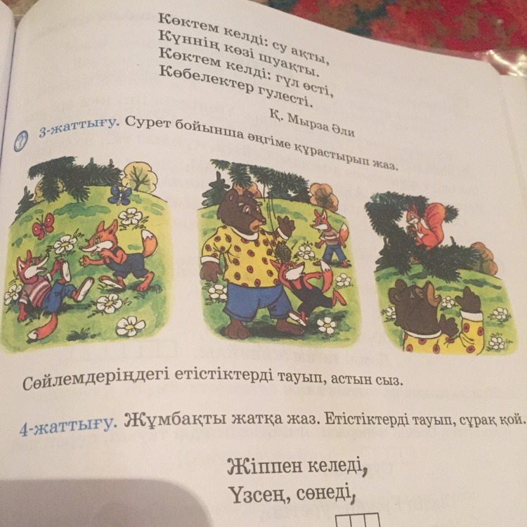 Баягыда быр екы дос тулкылер болыпты.Быр куны бырыншы тулкы екыншы тулкыден кашып ойнап жургенде бырыншы тулкыге тиын жангак лактырады да бырыншы тулкы кашып бара жатып аюга согылып калады.Бырыншы тулкы ары карай каша жонеледы.Содан кейын аю тиынга айтады.