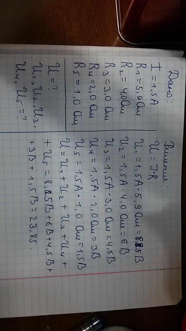 по неразветленному участку электрической цепи проходит электрический ток силой I = 1,5 A. Определите напряжение на концах участка и на каждом из резисторов, если их сопротивления R1=5,9 Ом, R2=4,0 Ом, R3=3,0 Ом, R4=2,0 Ом,R5=1,0 Ом