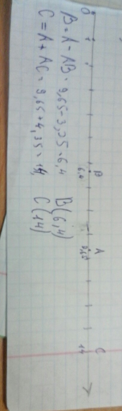 На координатном луче отмечена точка А(9,65). Точка В расположена левее, а точка С -правее от точки А . АВ -3,25 и АС-4,35. Найдите координаты точек В и С.