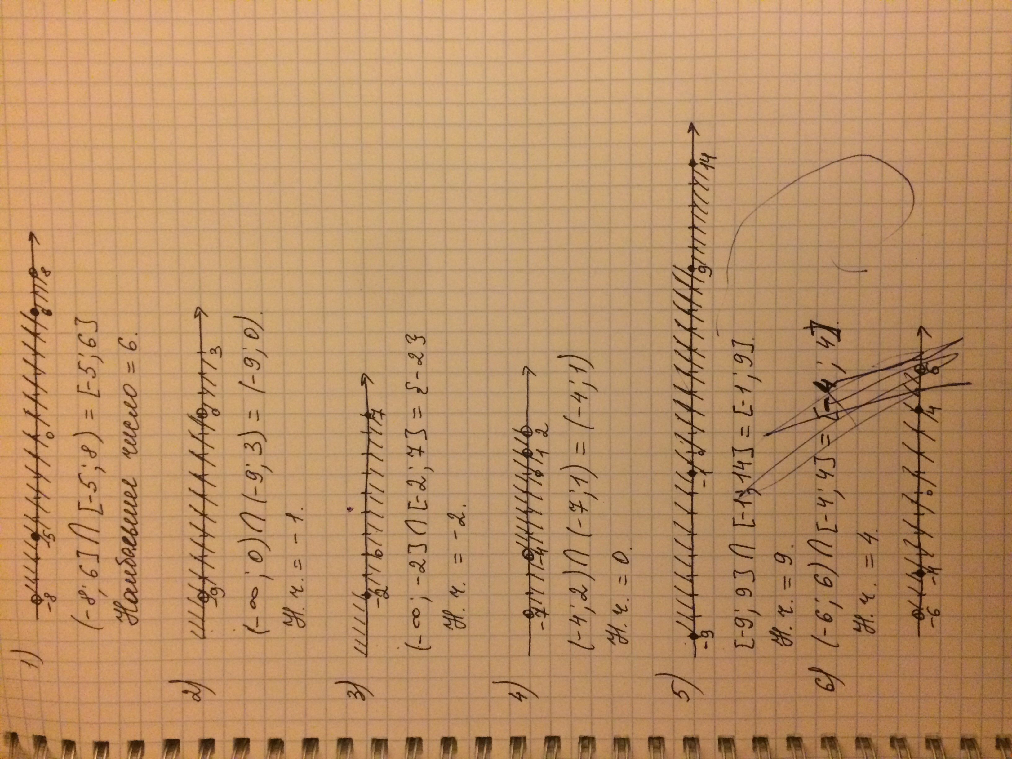 изобразите заданные промежутки на координатной прямой. запишите пересечение промежутков. укажите наибольшее целое число, принадлежащее пересечению промежутков:1) (-8;6] и [-5;8) 2) (-бесконечность;0) и (-9;3) 3) (-бесконечность;-2] и[-2;7] 4) (-4;2) и (-7;1) 5) [-9;9] и[-1;14] 6) (-6;6)и[-4;4]<br />