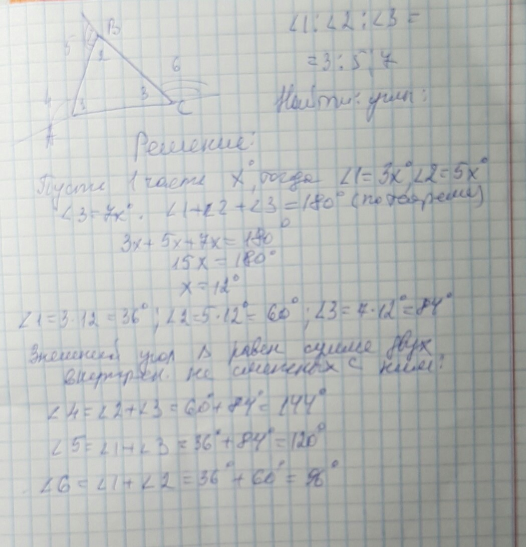 Внутренние углы треугольника абс пропорцианальны числам 3,5и7: Найти а)углы треугольника абс б)найти внешние углы