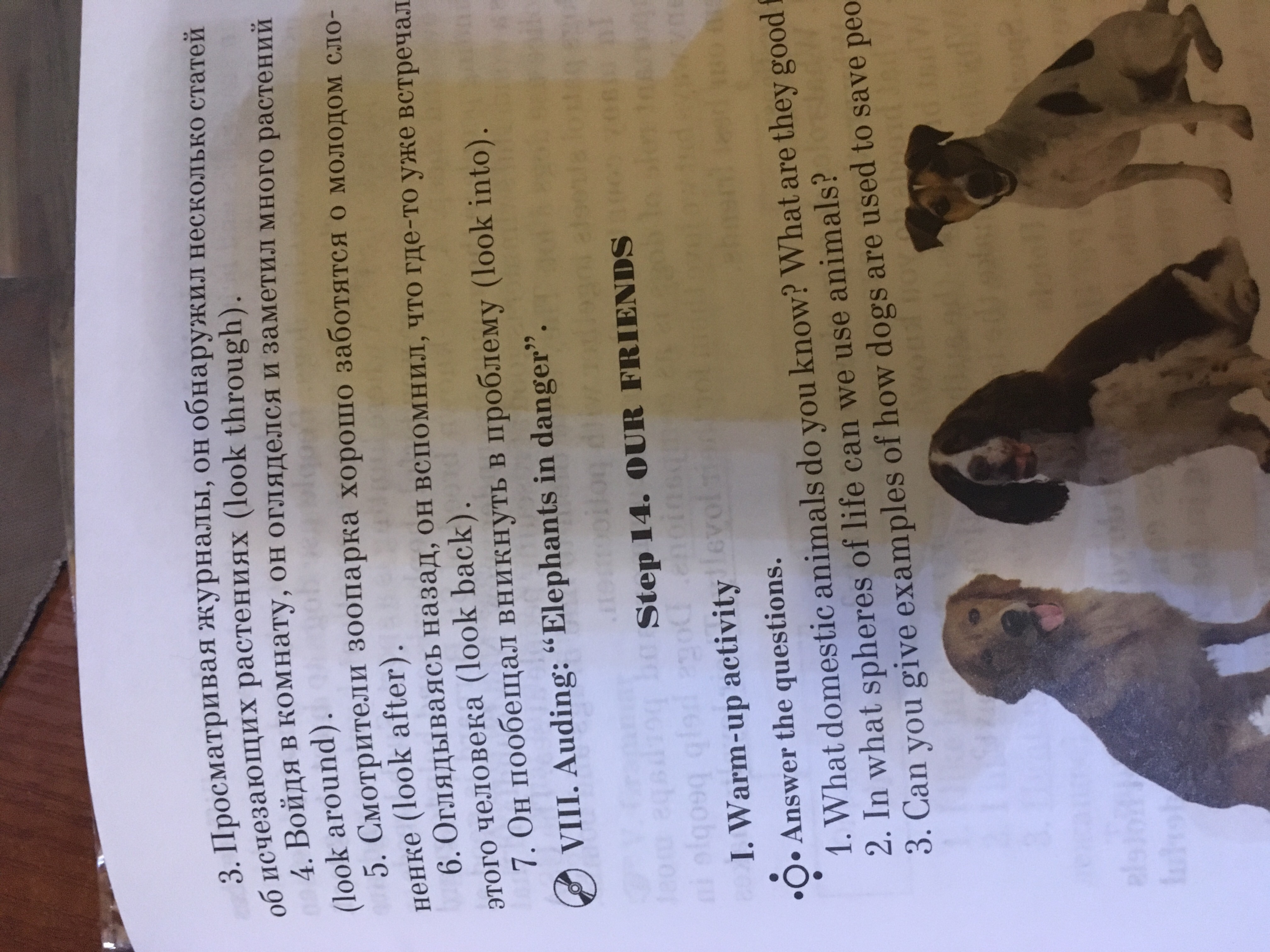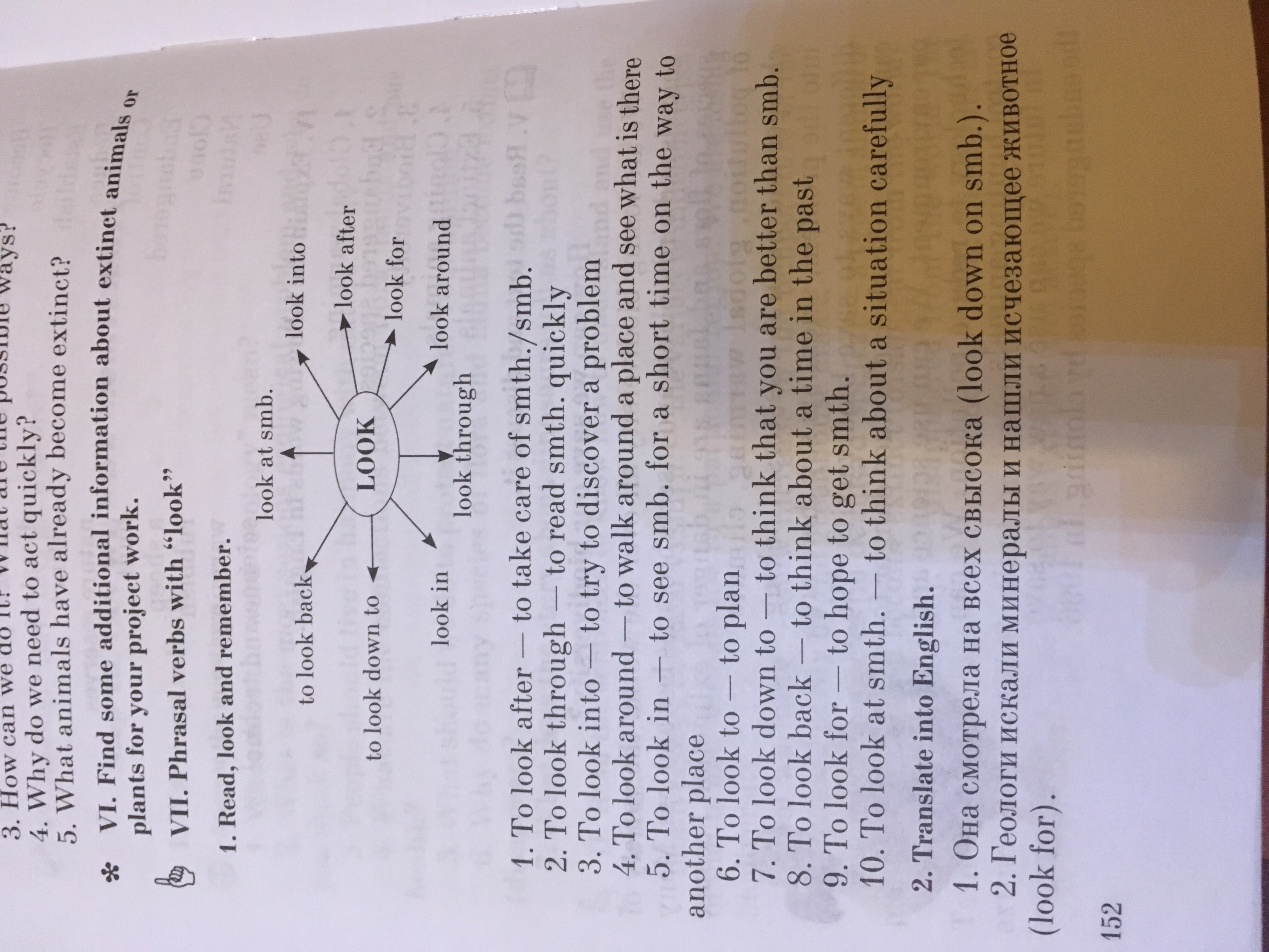 1 She looked down on everybody 2 Geologists were looking for minerals, and found an extinct animal 3 Looking though some magazines, he found a few articles about some plants that were becoming extinct (= about some endangered plants) 4 Having entered the room, he looked around and saw a lot of plants there 5 The zoo keepers look after the young elephant very well 6 Looking back, he remembered that he had already met that person somewhere 7 he promised to look into the problem