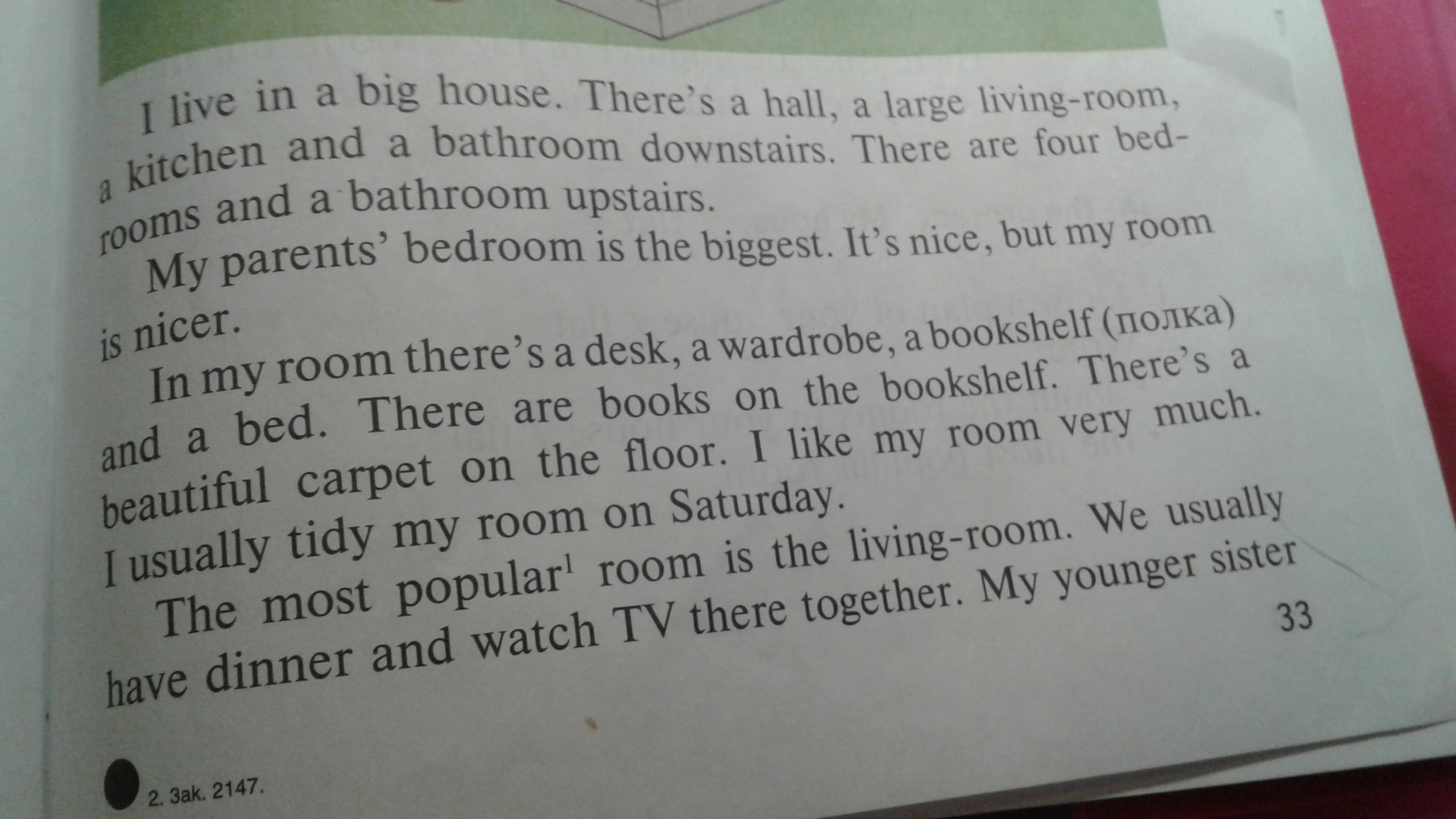 я живу В большом доме. там есть большая гостинная, кухня и ванная на 1 этаже
