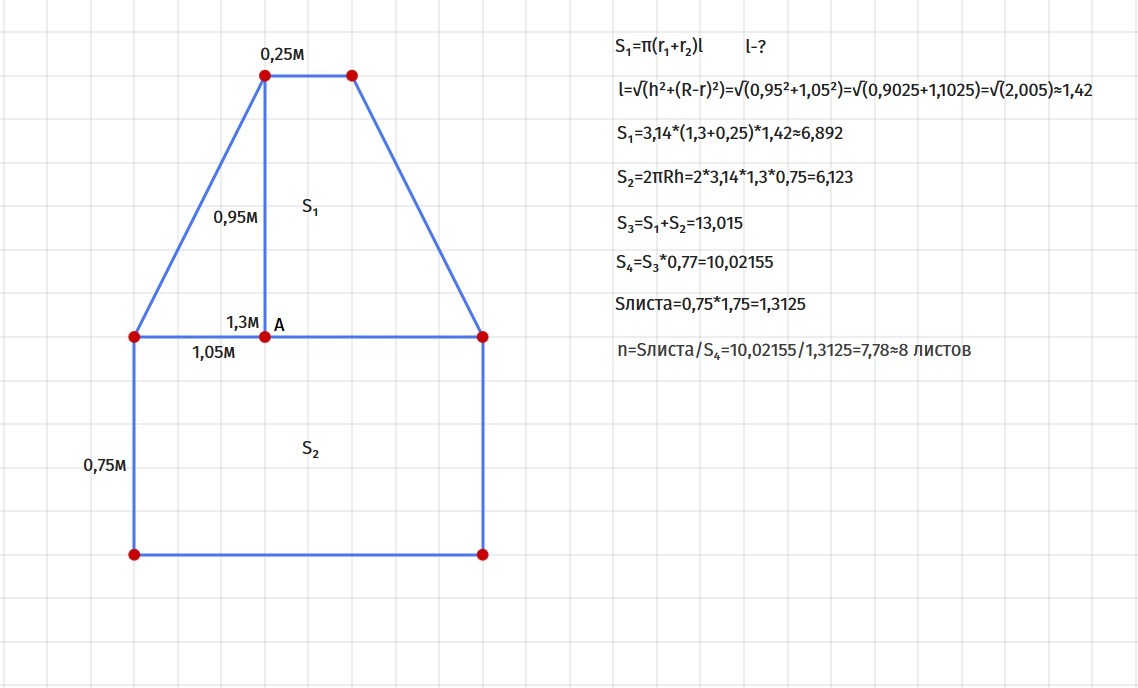 Мельничный желоб имеет форму боковой поверхности прямого кругового усеченного конуса и боковой поверхности прямого кругового цилиндра. Известно, что радиусы оснований усеченного конуса равны 1,3м и 0,25м, высота усеченного конуса 0,95м, а длина образующей цилиндра 0,75м. Найдите число листов жести, необходимой для изготовления желоба, если размеры одного листа 0,75м Х 1,75м, а швы и отходы составляют 23% от полной поверхности желоба (π=3,14).