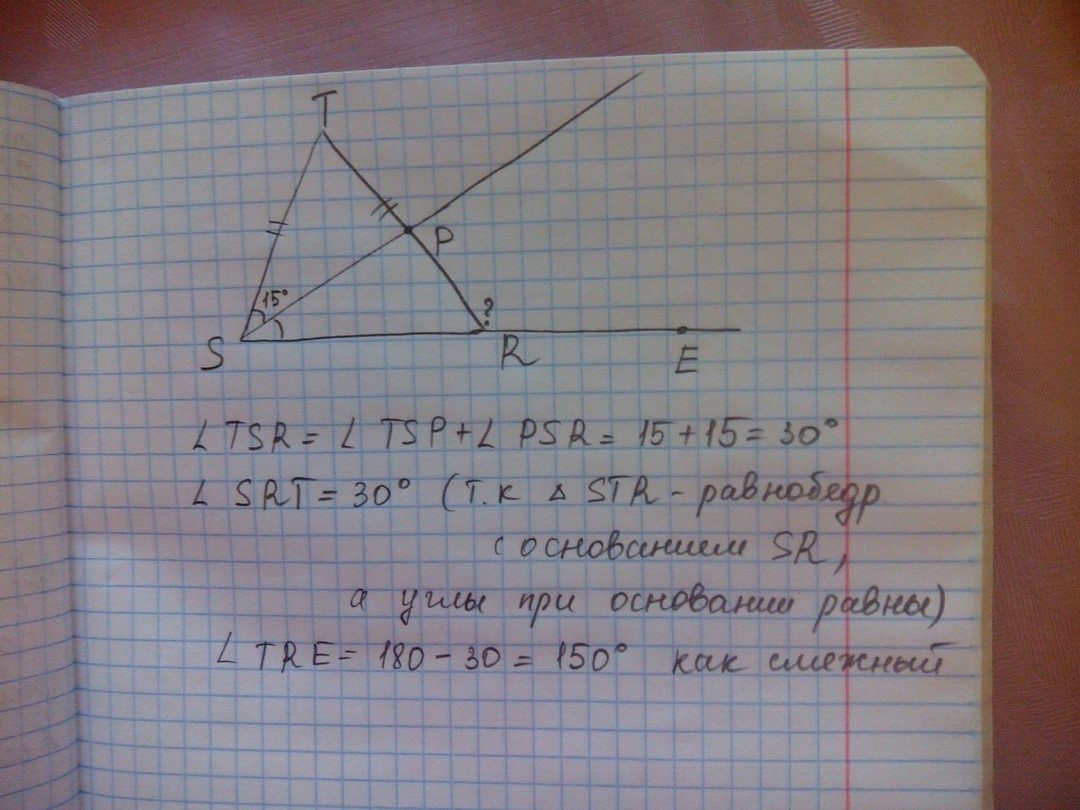 в равнобедренном треугольнике STR с основанием SR проведена биссектриса SP. Точка E лежит на продолжении стороны SR так, что точка R находится между точками S и E. Угол TSP равен 15 градусам. Найдите угол TRE. Ответ дайте в градусах. Помогите пожалуйста, умоляю
