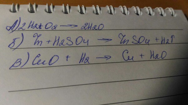 Написать уравнения реакций согласно схемам, указать тип реакций: А) H2 + O2→ ? б) Zn + H2SO4 → ZnSO4 + ? в) CuO + H2 → ? + ?