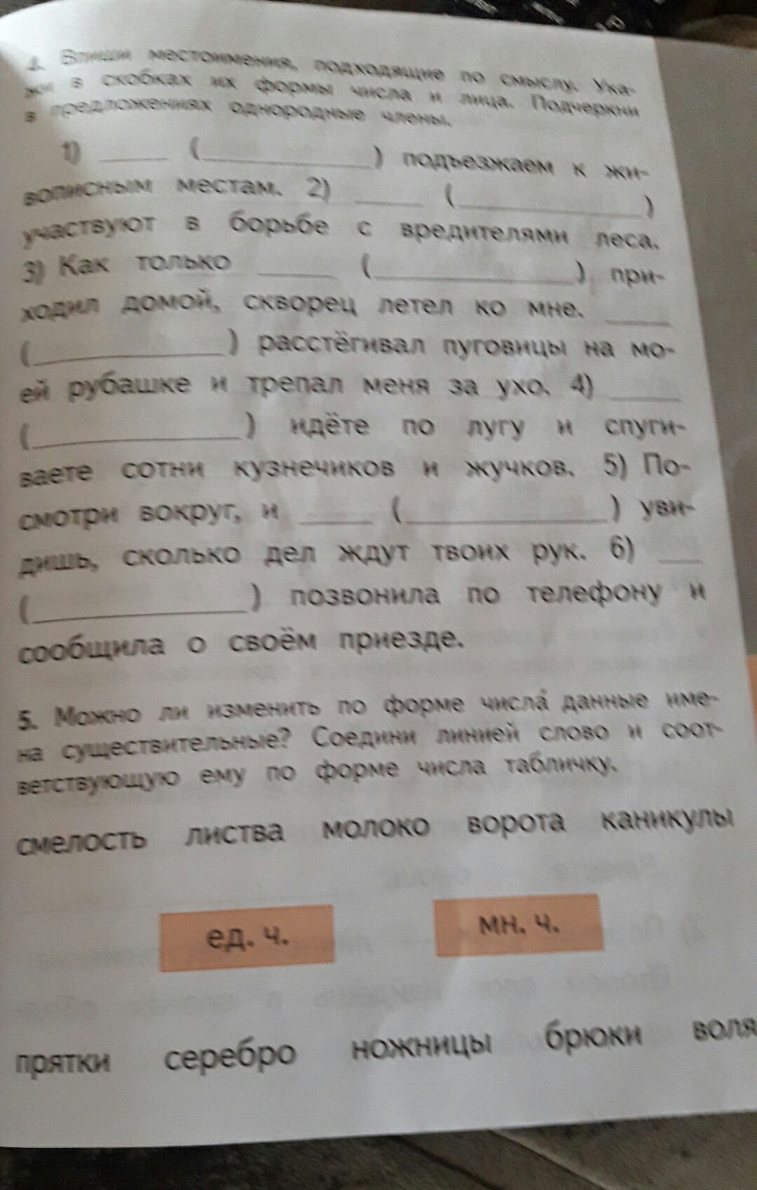 Впиши местоимения, подходящие по смыслу. Укажи в скобках их формы числа и лица. Подчеркни в предложениях однородные члены.