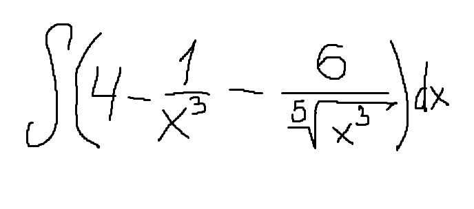 S(4 -1/x^3 -6/корень5степенииз3(x))dx = S(4)dx -S(x^-3)dx -S( 6/x^(3/5) )dx = 4x -x^2/2 - 30/8 * x^8/5 = 4x -x^2/2 - 15/4 * x^8/5 +C, C=const