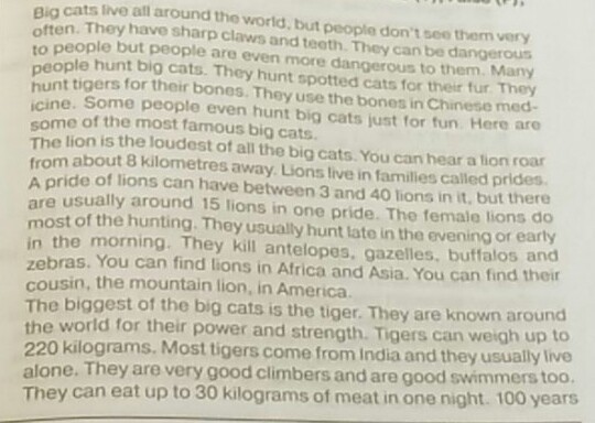 Большие кошки живут по всему миру, но люди не очень часто видят их . У них острые когти и зубы. Они могут быть опасны для людей, но люди еще более опасны для них. Многие люди охотятся на больших кошек. Они охотятся на пятнистых кошек ради меха. Они охотятся на тигров из-за их костей. Они используют кости в китайской медицина. Некоторые люди даже охотятся на больших кошек просто для удовольствия. Вот некоторые из самых известных больших кошек.