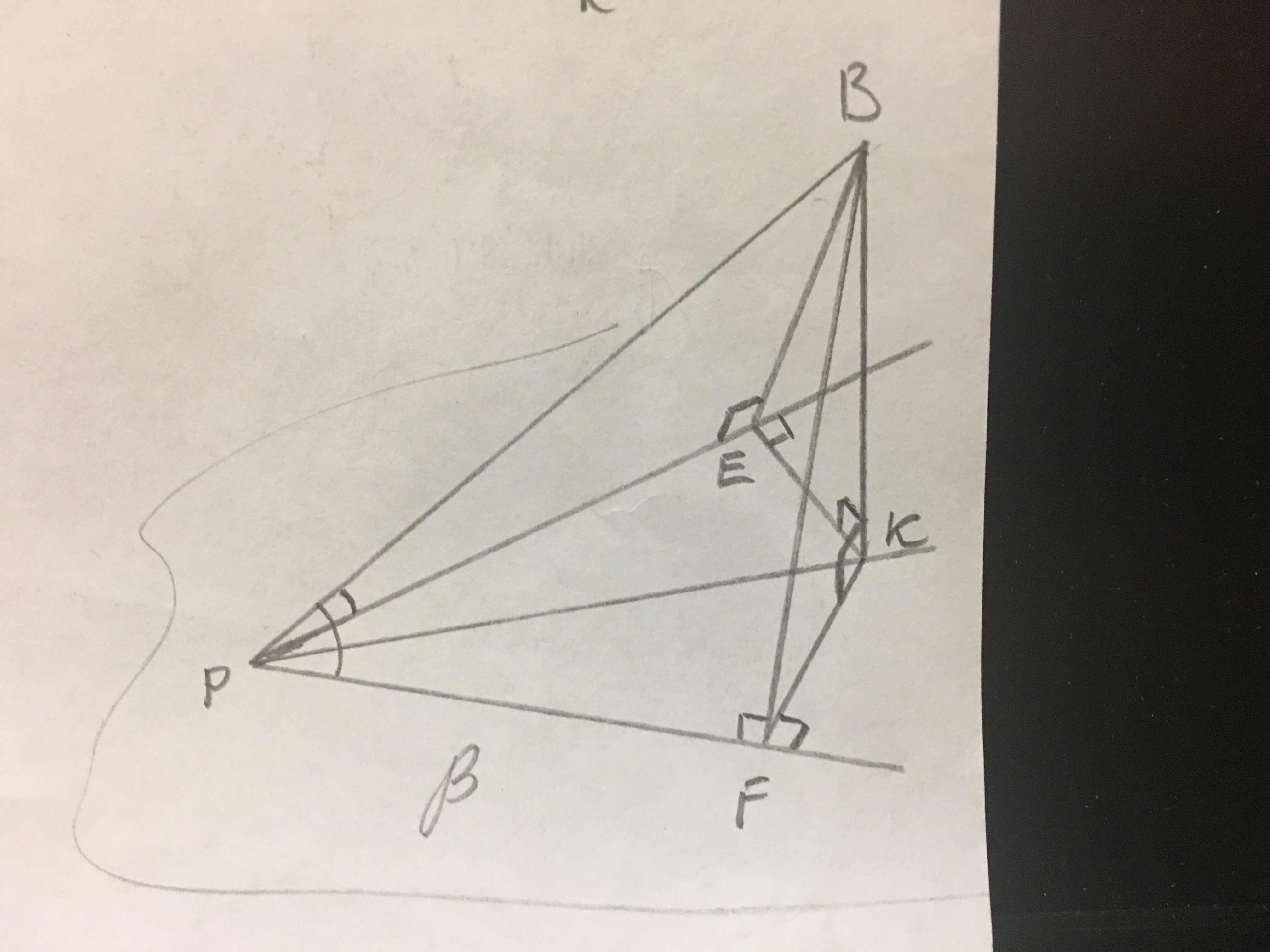 К плоскости b проведена наклонная BP (P принадлежит плоскости b), которая образует равные углы с прямыми PE и PF, лежащими в плоскости b. Докажите, что углы, образованные прямыми PE и PF с проекцией наклонной BP на плоскость b, равны.