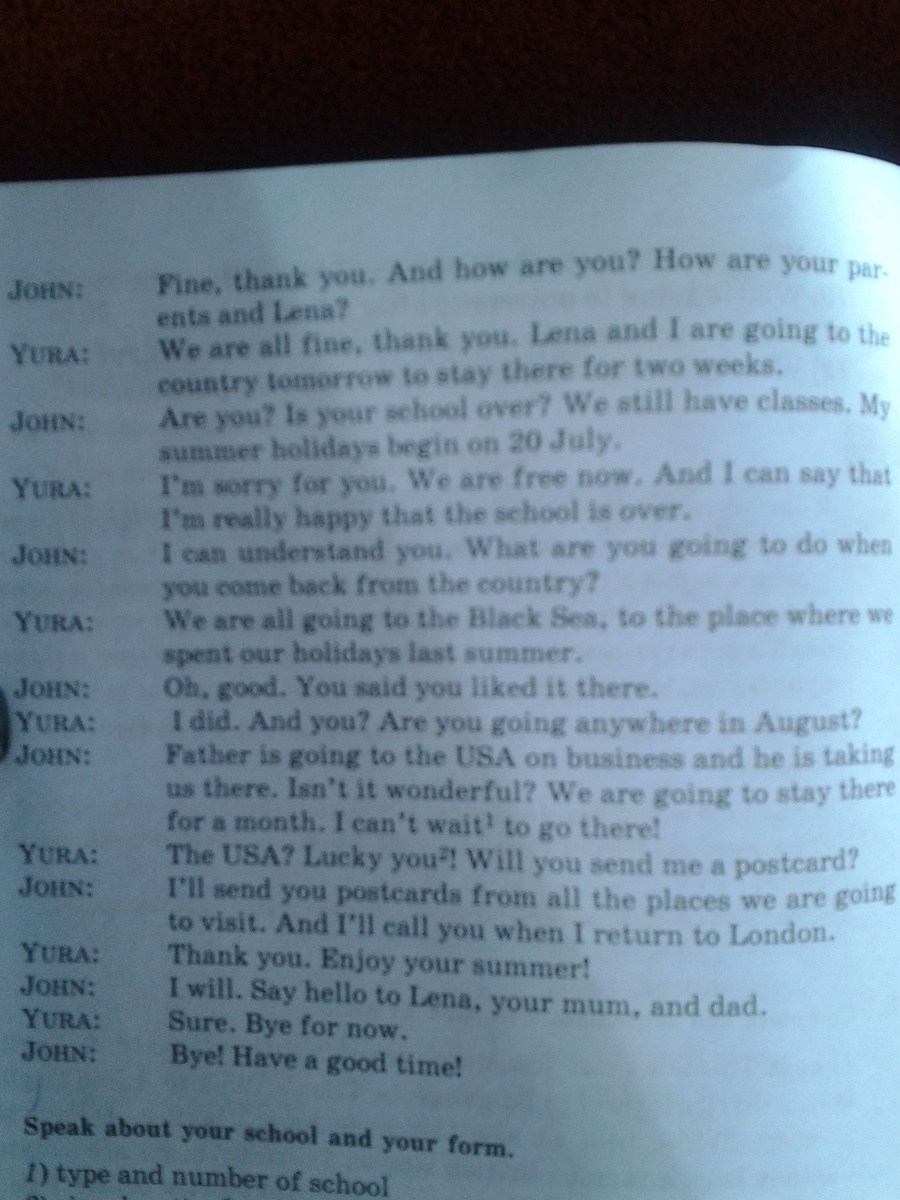 Джон: Правда? Учебный год уже закончился? У нас до сих пор уроки. Мои летние каникулы начинаются с 20-го июля.