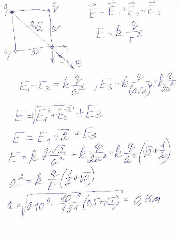 В трех вершинах квадрата находятся точечные заряды по 1 нКл, которое создают напряженность поля в четвертой вершине квадрата 191 В/м, то сторона квадрата равна?
