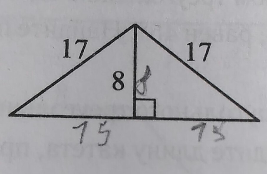 Рассмотрим прямоугольный треугольник, его площадь=1/2*8*15=60. Площадь всего треугольника равна площади 2 прямоугольных треугольник. S=60*2=120
