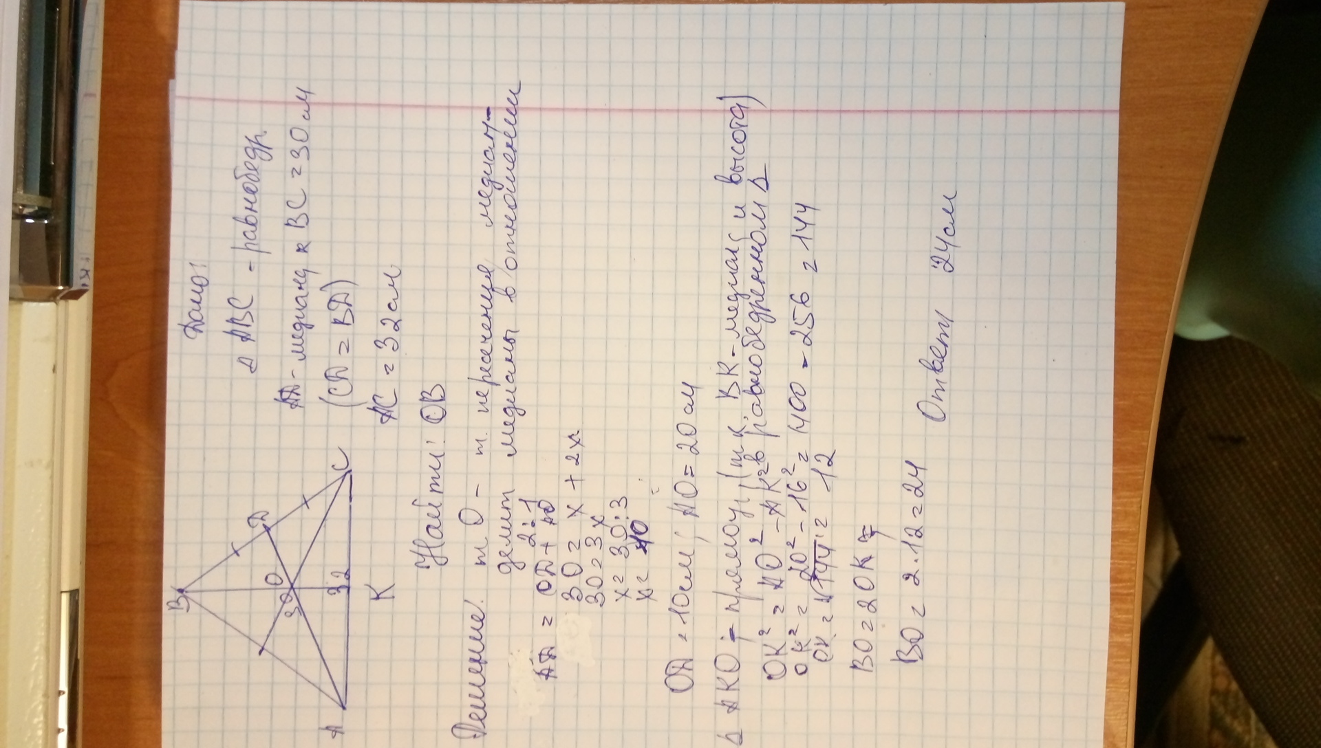 Медиана равнобедренного треугольника, проведенная к боковой стороне, равна 30 см, а его основание - 32 см. Найдите расстояние от точки пересечения медиан до вершины треугольника, противолежащей основанию.