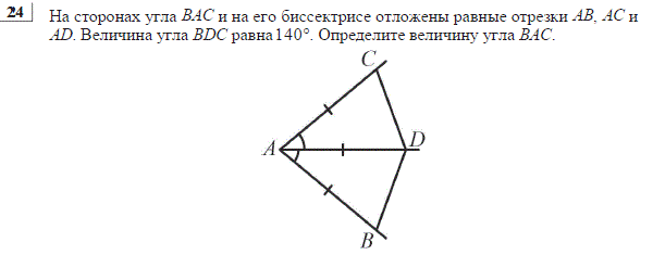 на сторонах угла bac и на его биссектрисе отложены равные отрезки AB, AC и AD. Величина угла DCD равна 140. Определить величину угла BA