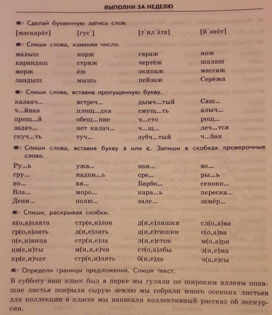 6. в субботу наш класс был в парке. мы гуляли по широким аллеям. опавшие листья покрыли сырую землю. мы собрали много осенних листьев для коллекции. в классе мы написали коллективный рассказ об экскурсии