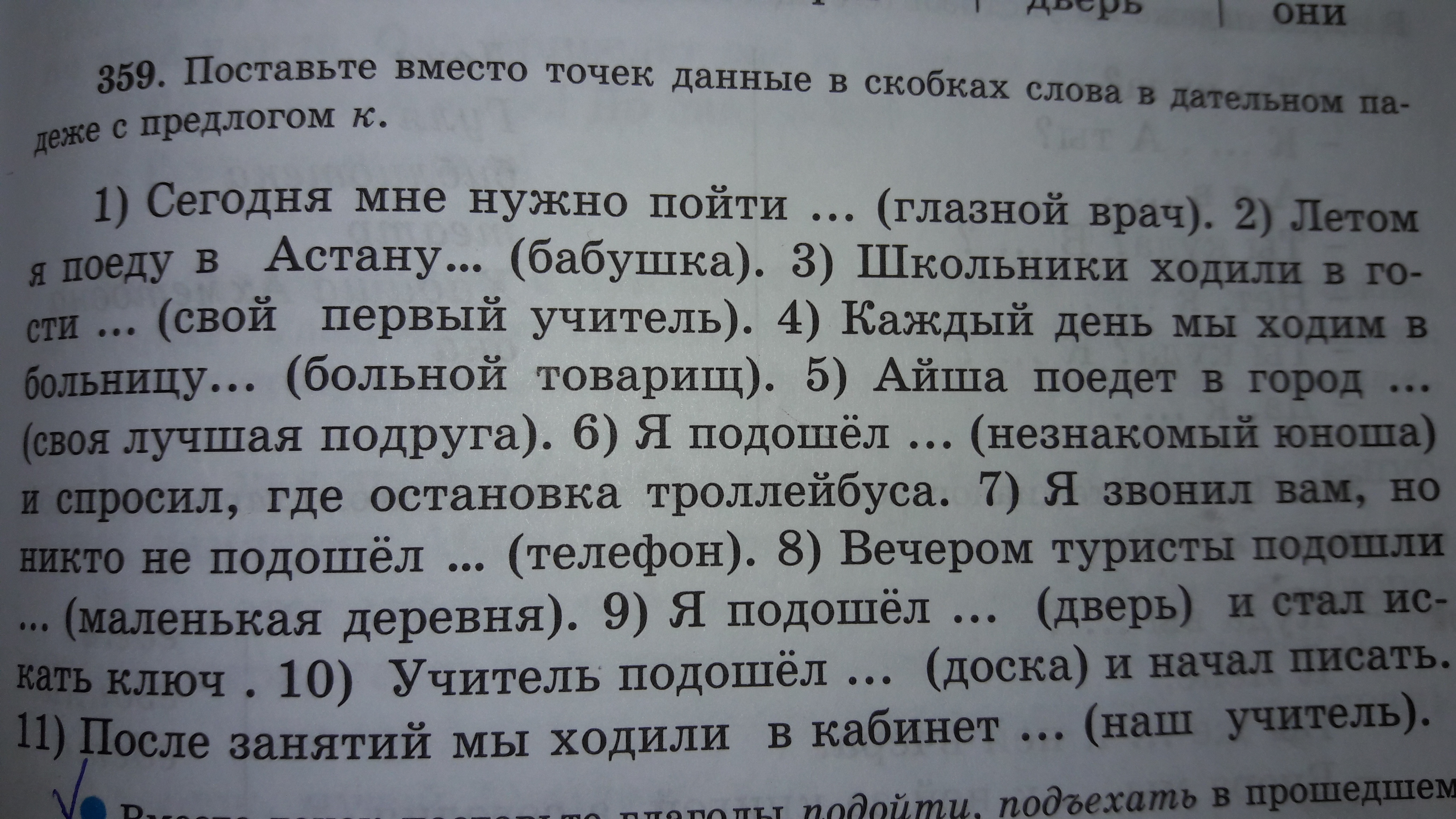 Сегодня мне нужно пойти к глазному врачу.Летом я поеду в Астану к бабушке.Школьники ходили в гости к своему первому учителью.Каждый день в ходим в больницу к больному товарищу.Айша поедет в город к своей лучшей подруге.Я подошел к незнакомому юноше и спросил где остановка троллейбуса.Я звонил вам,но никто не подошел к телефону.Вечером туристы подошли к маленькой деревне. Я подошел к дверью и стал искать ключ.Учитель подошел к доске и начал писать.После занятий мы ходили в кабинет к нашей учителью