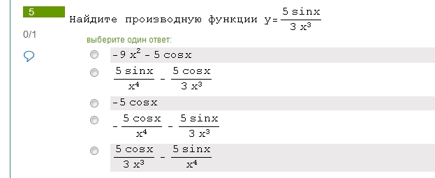 y'=[ (5sinx)' * 3x^3 - 5sinx*(3x^3)' ]/(3x^3)^2 =[15x^3*cosx - 45x^2*sinx] / 9x^6 = [15x^2*(x*cosx-3*sinx)] / 9x^6 = [5* (x*cosx-3*sinx)] / 3x^4 = 5x*cosx/3x^4 - 15sinx/3x^4 = 5cosx/3x^3 - 5sinx/x^4 - пятый вариант