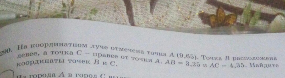 На координатном луче отмечена точка А(9,65).Точка В расположена левее,а точка С-правее от точки А. АВ=3,25 и АС=4,35.Найдите координаты точек В и С