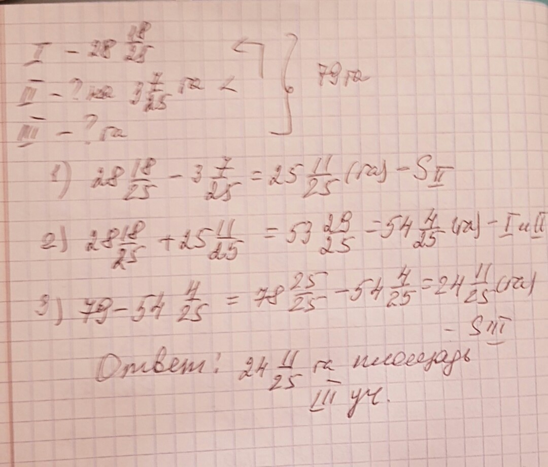 На трех участках площадью 79 га вырастили горох. Площадь второго участка на 3 725 га меньше площади первого. Найдите площадь третьего участка, если площадь первого 28 1825 га.