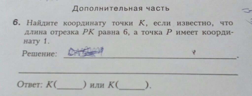 Решение:Все зависит в какую сторону по оси кординат отложен этот отрезок:Если отложен вправо, то кордината точки K вычисляеться 1+6=7