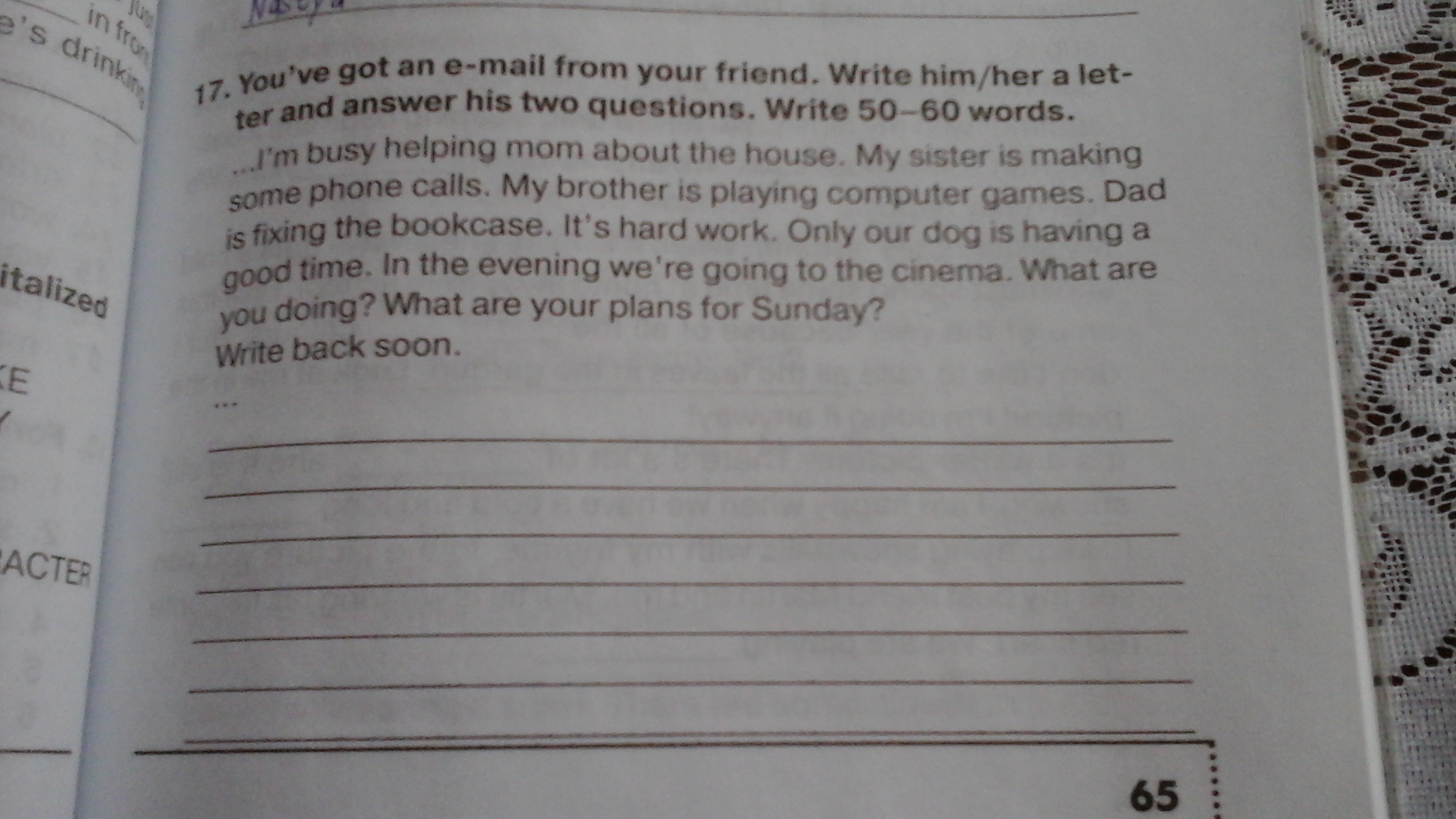 Hello Polina! Thanks for your e-mail. I am fine thank you. On weekends I am going to go to the park.