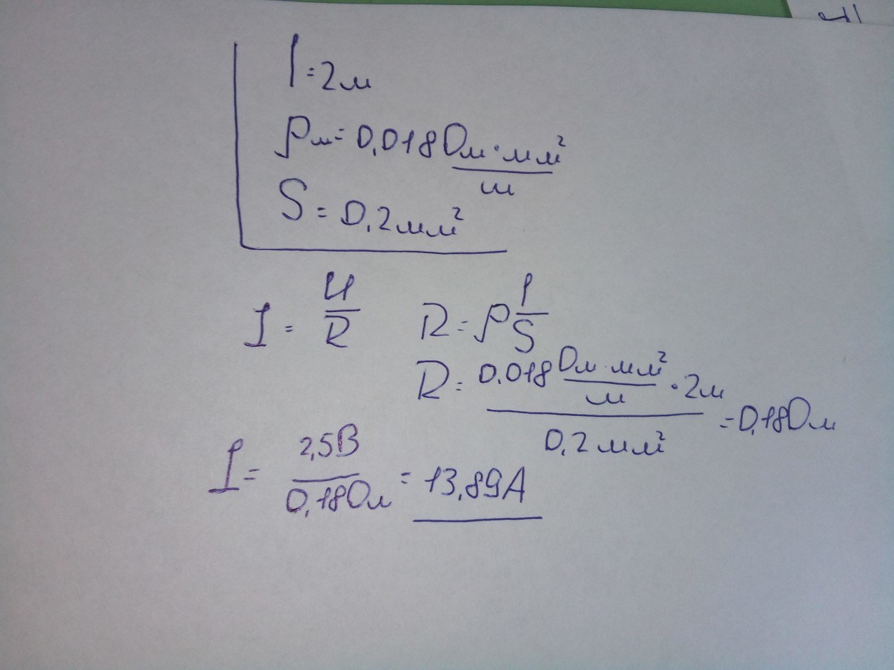 Двухметровый медный провод площадью поперечного сечения 0.2 ммквадратных подключен к гальваническому элементу с напряжением 2.5 вольт. определите силу тока через провод.