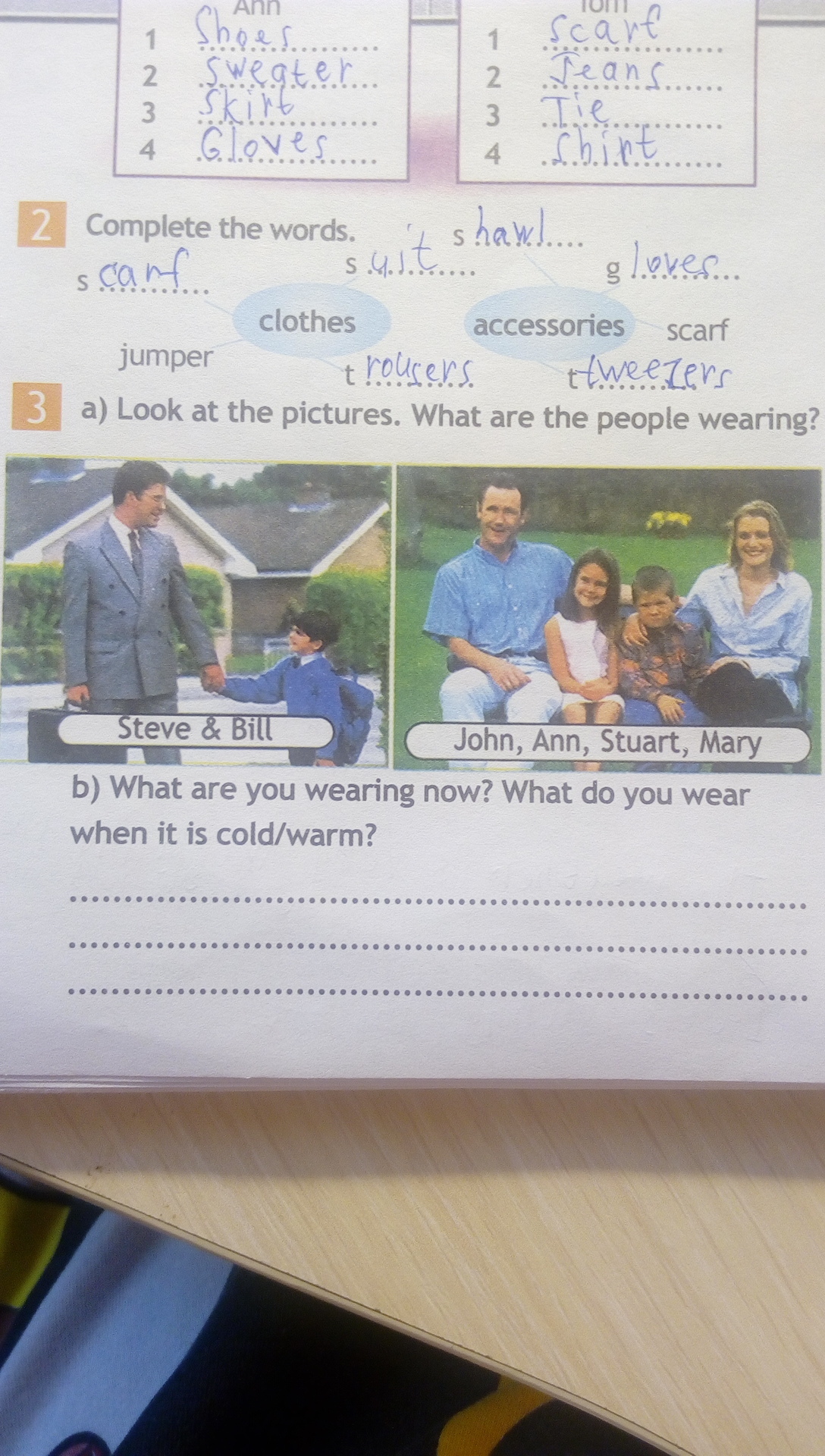 b) I am wearing a tracksuit now. I wear a warm coat when it is cold.