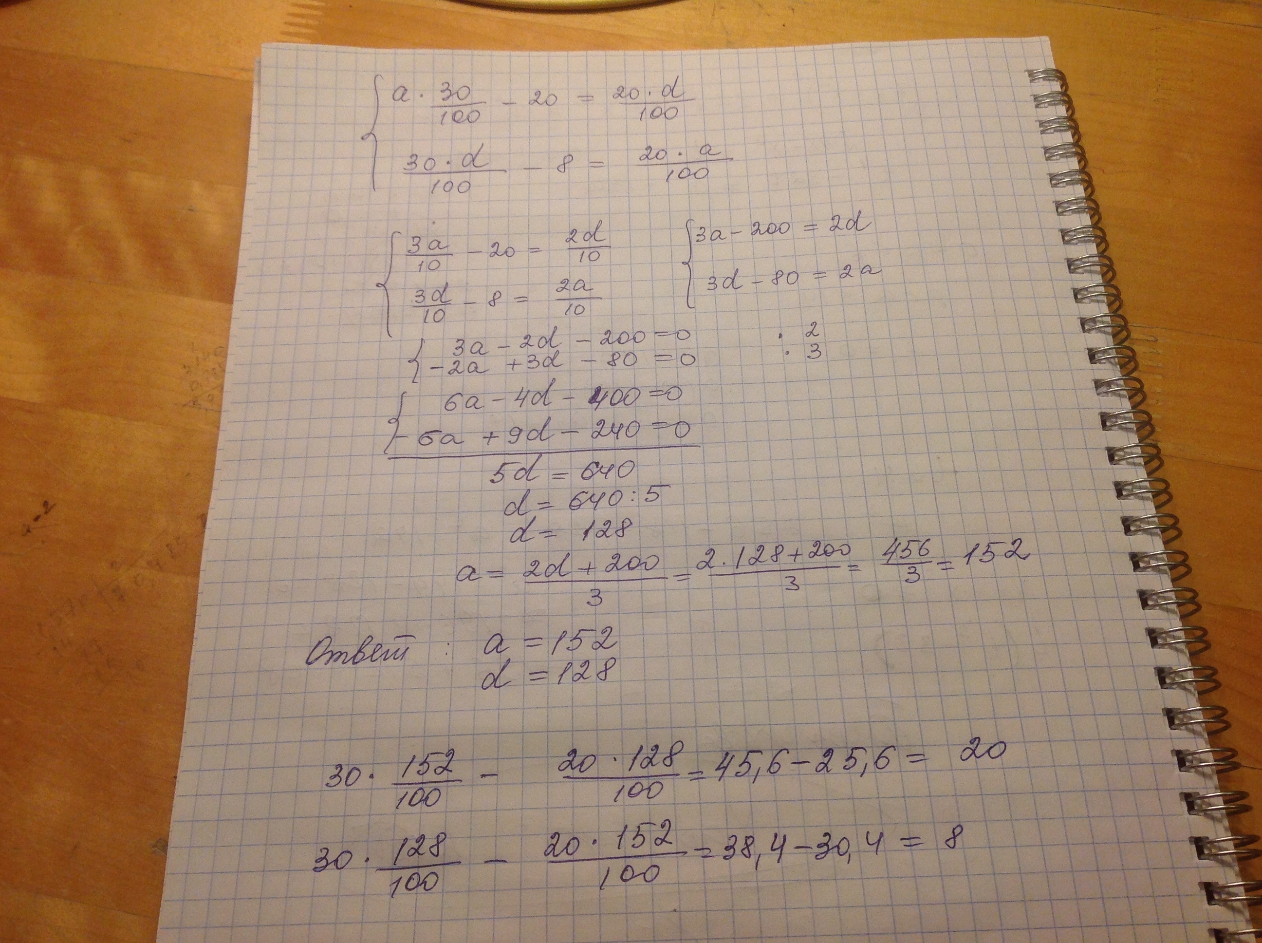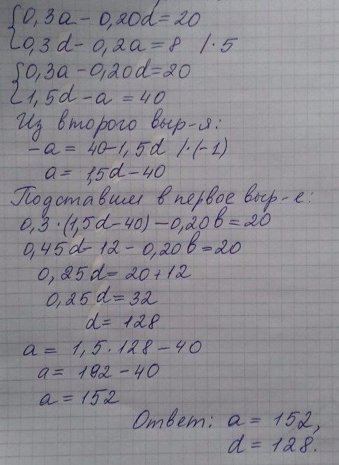 Известно, что 30% числа a на 20 больше, чем 20% числа d,