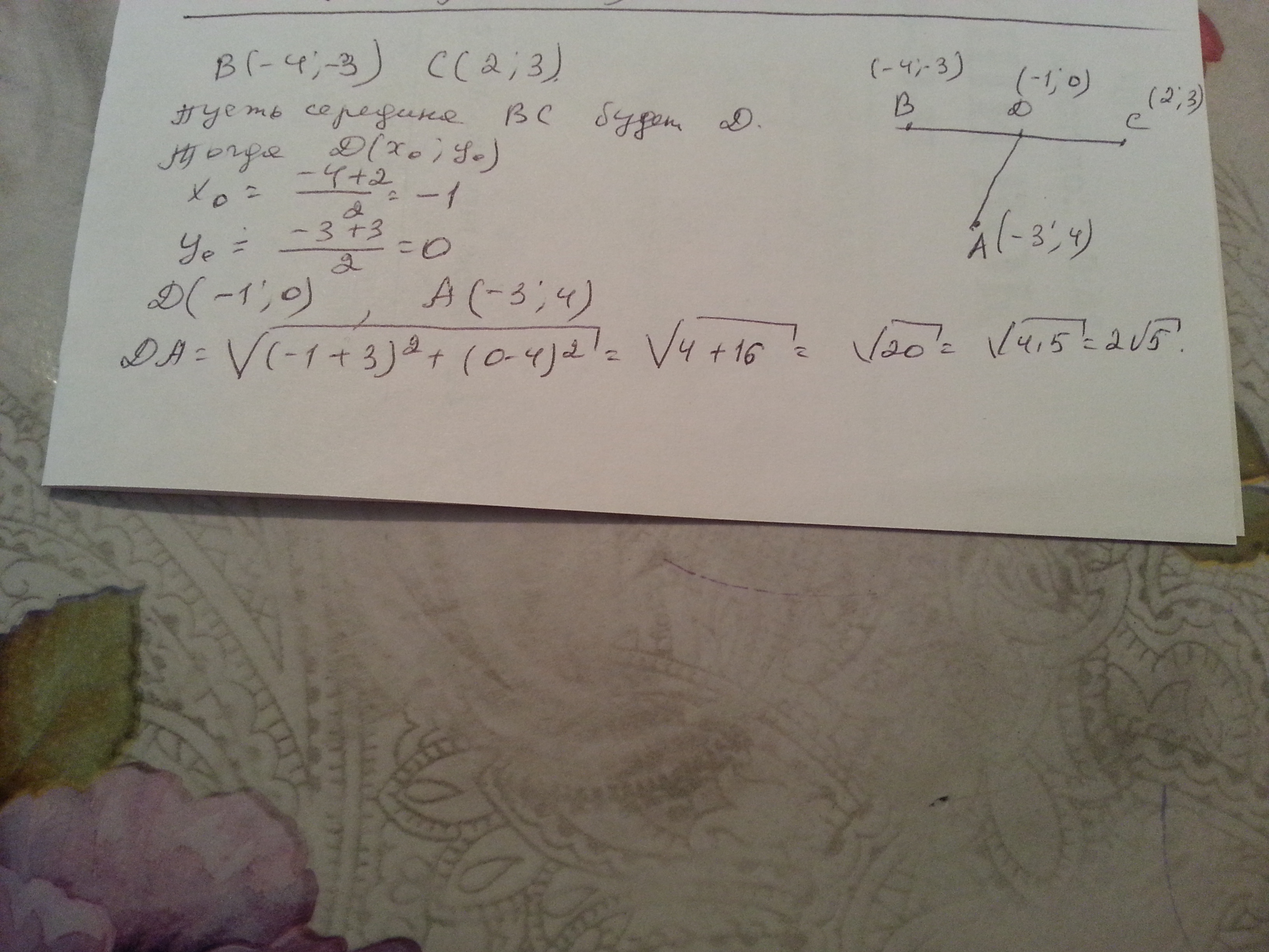найдите расстояние от точки А (-3;4) до середины отрезка ВС ,если