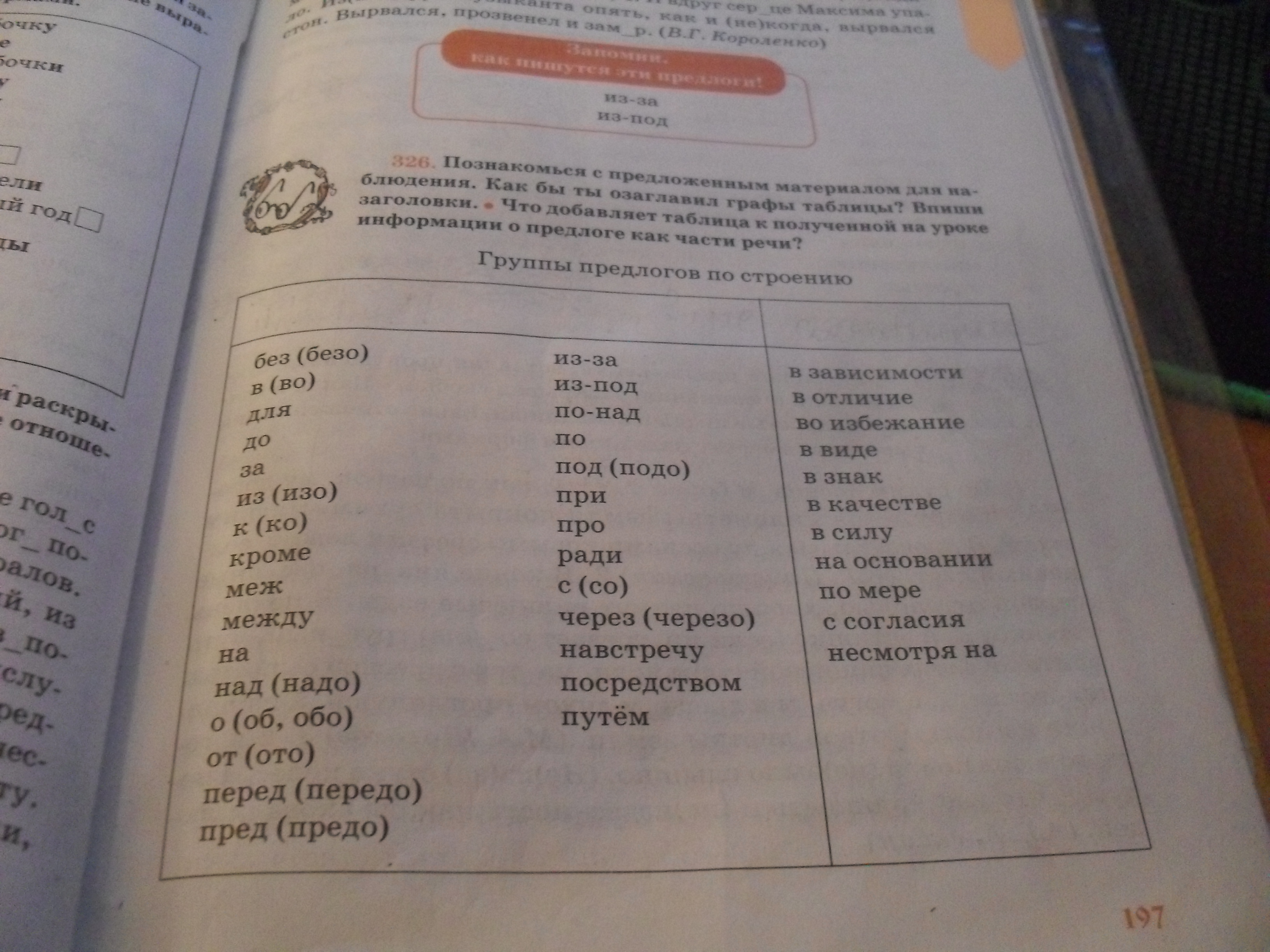 Познакомься с предложенным материалом для наблюдения. Как бы ты озаглавил графы таблиц ? Впиши заголовки. Что добавляет таблица к полученной на уроке информации о предлоге как части речи?