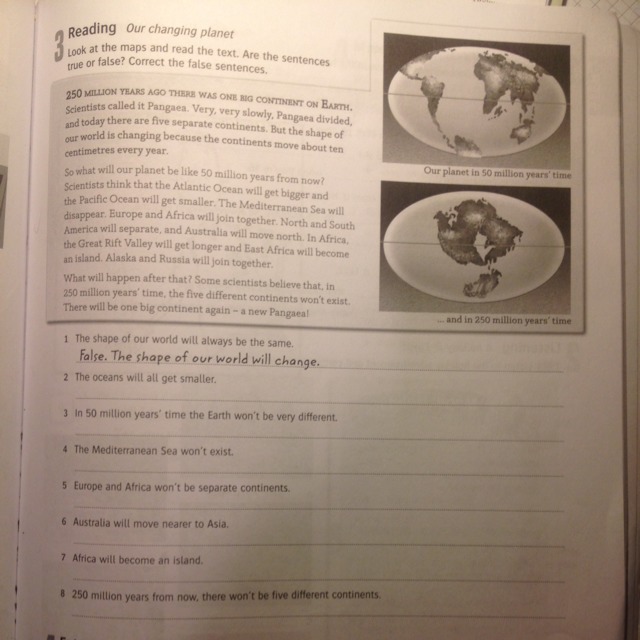3. False. Oceans will change their sizes, the Meditarranean Sea will disappear, Europe and Africa will goin together, both Americas will separate, and Australia will move north, East Africa will become an island, Alaska and Russia will joing together too.