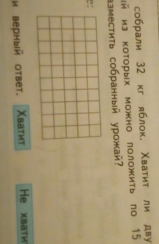 в саду собрали 32 килограмм яблок Хватит ли 2 мешков В каждый из которых можно положить по 15 кг яблок чтобы разместить собранный урожай