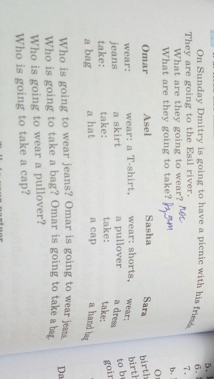 Ну нужно вроде написать что каждый из них с собой возьмёт и оденет
