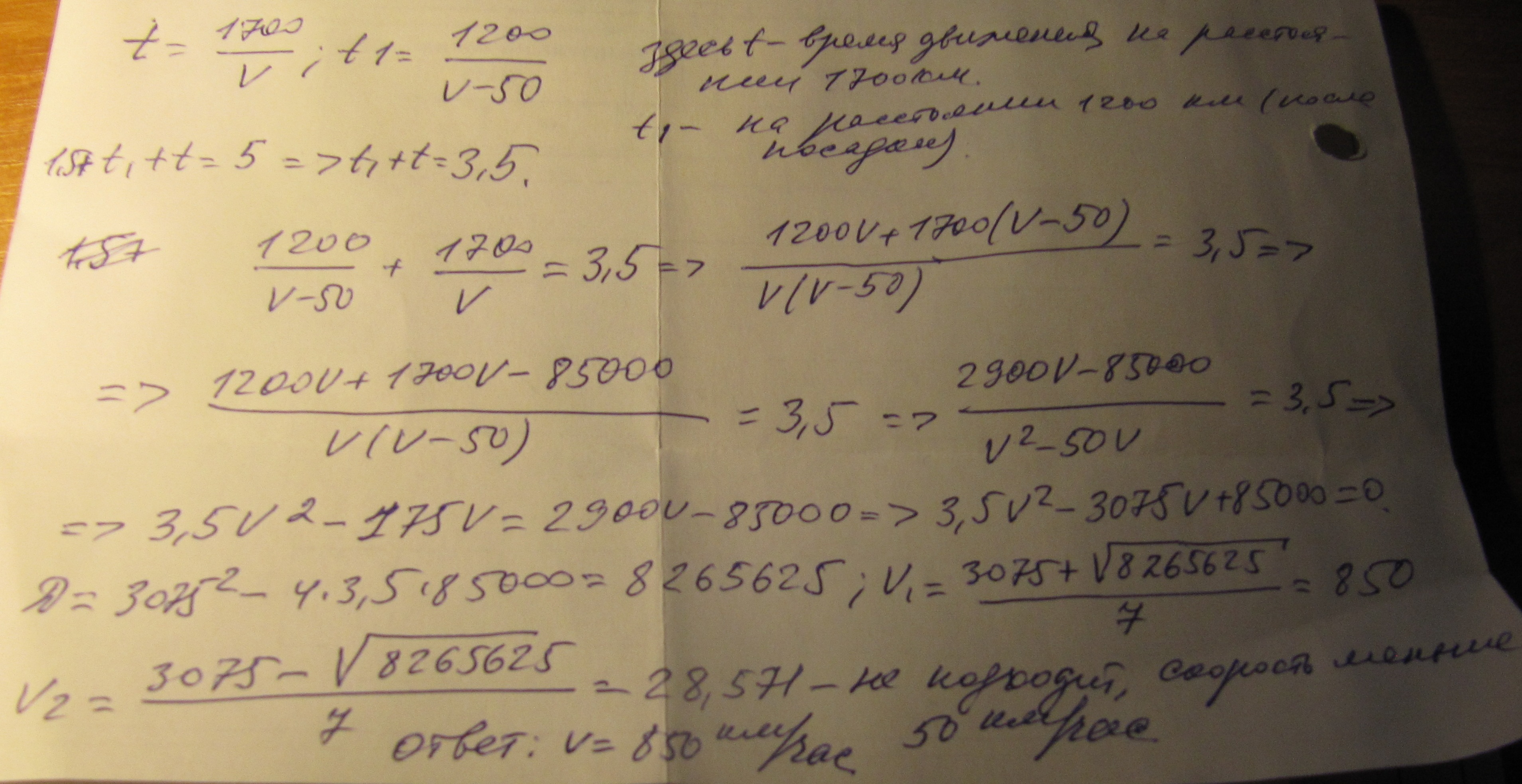 Самолет должен пролететь 2900 км. Пролетев 1700 км, он сделал вынужденную посадку на 1 ч 30 мин, после чего полетел со скоростью на 50 км/ч меньшей, чем раньше. Найти первоначальную скорость самолета (км/ч) , если известно, что он прибыл на место через 5 ч после вылета.