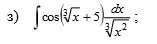 int cos(sqrt[3]{x}+5)cdot  frac{dx}{sqrt[3]{x^2}} =[; t=sqrt[3]{x}+5; ,; dt=(sqrt[3]{x}+5)'cdot dx=\\=(x^{frac{1}{3}})'dx=frac{1}{3}cdot x^{-frac{2}{3}}, dx=frac{1}{3}cdot frac{dx}{sqrt[3]{x^2}}; ]=3cdot int costcdot dt=\\=3cdot sint+C=3cdot sin(sqrt[3]{x}+5)+C